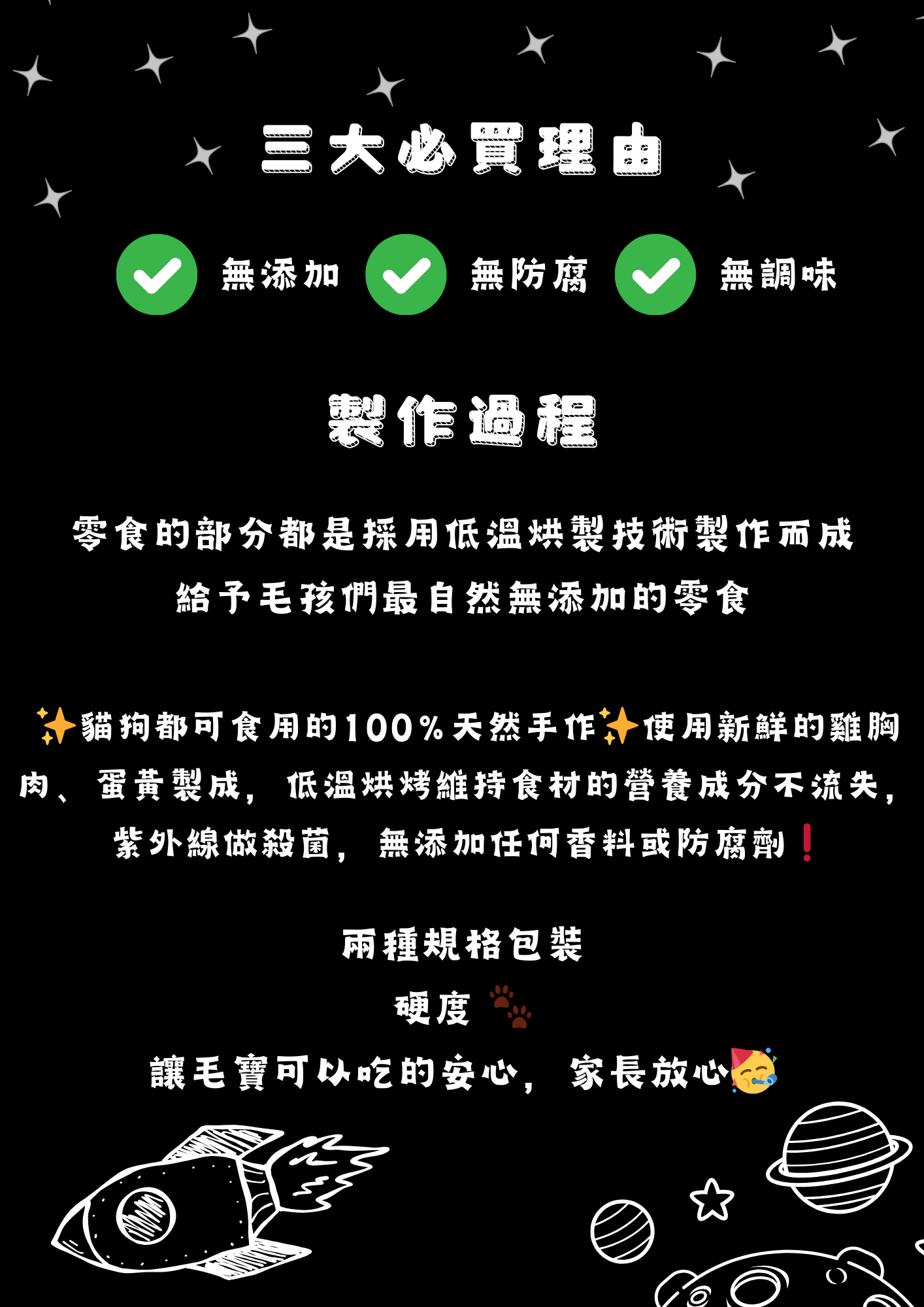 ✨貓狗都可食用的100%天然手作✨使用新鮮健康雞胸肉、蛋黃烘乾製成,一口接一口絕對是人寵共食的最棒選擇,低溫烘烤維持食材的營養成分不流失,紫外線做殺菌,無添加任何香料或防腐劑❗️